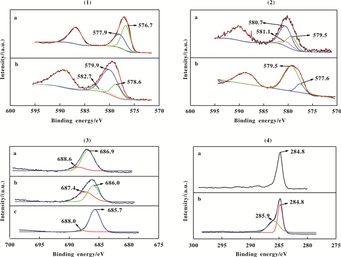 Fig.2 (1) XPS spectra of the Cr 2p for Zn/Cr2O3 catalysts (a) before and (b) after 118 h, reaction; (2) XPS spectra of the Cr 2p for (a) Co/Al/Cr2O3 catalyst after 120 h, reaction, and (b) Zn/Al/Cr2O3 catalyst after 112 h, reaction; (3) XPS spectra of the F 1s for (a) Zn/Cr2O3 catalyst after 118 h, reaction, (b) Co/Al/Cr2O3 catalyst after 120 h, reaction, and (c) Zn/Al/Cr2O3 catalyst after 112 h, reaction; (4) XPS spectra of the C 1s for Zn/Cr2O3 catalysts (a) before and (b) after 118 h reaction. |