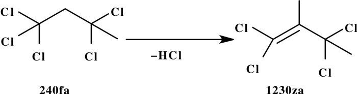 1.2 Catalytic fluorinationHCC-240fa is synthesized by any means well known in the literature[30-32], and the synthesis of HCC-1230za (Scheme 1) is carried out using HCC-240fa as startng material as follow: 160 g of activated carbon is added to the quartz glass tube (1.5 m × 30 mm), using the method of upper feed and lower discharge. In order to ensure the smooth discharge of the product, a nitrogen purge is introduced during the reaction. The flow rate of nitrogen gas is 10 mL/min, the reaction temperature is controlled at 190~200 ℃, and the product is collected by ice salt bath cooling. During the whole reaction stage, GC analysis using a gas chromatograph (Agilent GC-7890) equipped with a flame ionization detector (FID) and a HP-5 (30 m) capillary column follows the reaction. A total of 3.0 kg HCC-240fa was input, the feed rate was 30 mL/h, and the unreacted HCC-240fa adsorbed by activated carbon was 0.32 kg. The theoretical product should be 2.23 kg, while the actual collected product HCC-1230za was 2.0 kg. The yield is 89.6%, and GC content of HCC-1230za is >94%.