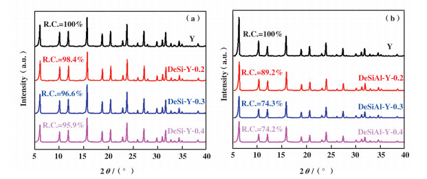 2 结果与讨论 2.1 改性对Y型沸石晶体结构的影响由图 1可见, 不管是用不同浓度的NaOH溶液(0.2、0.3和0.4 mol/L)对Y沸石进行单独的碱处理改性(图 1a), 还是在不同浓度的NaOH溶液改性之后继续对Y沸石用0.2 mol/L的稀硝酸溶液进行酸处理改性(图 1b), 所得到的两个系列改性样品都在6.09°、10.11°、11.85°、15.6°、18.62°、20.37°和27.15°处出现了八面沸石的典型特征峰, 说明上述碱改性和碱-酸组合改性都可以很好地保留Y型沸石的晶体结构. 不过, 从图 1a中可以看出, 随着NaOH溶液浓度的增大, 改性样品中的Y沸石相对结晶度略有降低. 从图 1b可以看出, 经过不同浓度NaOH溶液改性过的Y沸石样品(DeSi-Y)继续用稀硝酸处理后, 其Y沸石的相对结晶度均大幅度下降. 具体原因将在下文中分析.