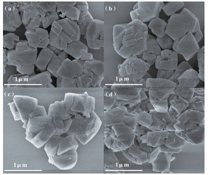 图 2 Y沸石母体(a)及其碱改性样品(b-d)的场发射扫描电镜图片 Fig.2 Field emission SEM images of Y zeolite parent (a) and its alkali modified samples (b-d) (b) DeSi-Y-0.2; (c) DeSi-Y-0.3; (d)DeSi-Y-0.4 |