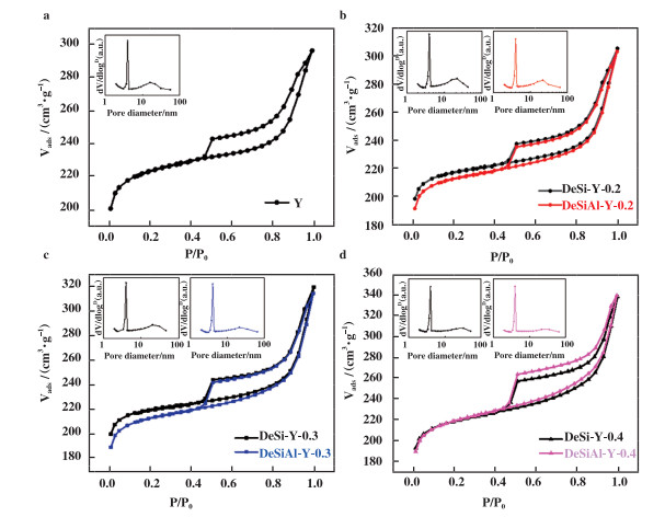 图 3 Y沸石母体及其碱改性(DeSi-Y)、碱-酸组合改性样品(DeSiAl-Y)的氮气物理吸附等温线和孔径分布曲线 Fig.3 N2 physical adsorption isotherms and pore size distribution curves of Y zeolite and its alkali modifiedsamples (DeSi-Y) and alkali-acid modified samples (DeSiAl-Y) |