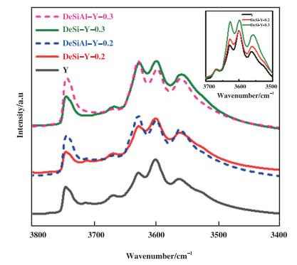 图 4 Y沸石母体及其碱改性样品(DeSi-Y)和碱-酸组合改性样品(DeSiAl-Y)的羟基振动FT-IR谱图 Fig.4 Hydroxyls stretching FT-IR spectra of Y zeolite parent and its alkali modified samples (DeSi-Y) and alkali-acidmodified samples (DeSiAl-Y) |
