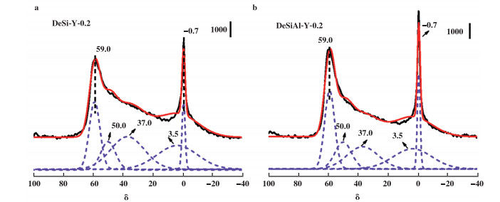 图 5 一种碱改性Y沸石样品(DeSi-Y-0.2)和一种碱-酸组合改性Y沸石样品(DeSiAl-Y-0.2)的27Al MAS NMR谱图 Fig.5 27Al MAS NMR spectra of an alkali modified Y zeolite (DeSi-Y-0.2) and an alkali-acid modified Y zeolite (DeSiAl-Y-0.2) |