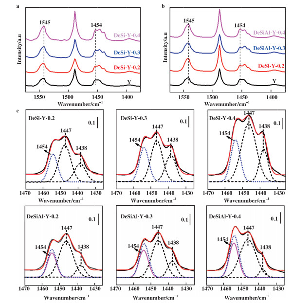 图 6 Y沸石及其碱改性样品(DeSi-Y)和碱-酸组合改性样品(DeSiAl-Y)的吡啶吸附FT-IR谱图(a, b)以及1450 cm-1区域吸收带的去卷积图(c) Fig.6 Pyridine adsorption FT-IR spectra (a, b) and the deconvoluted band of 1450 cm-1 region of Y zeolite and its alkali modified samples (DeSi-Y) and alkali-acid modified samples (DeSiAl-Y)(c) |