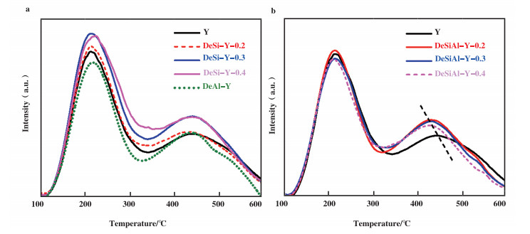 图 7中给出了Y沸石及其碱改性样品(DeSi-Y)和碱-酸组合改性样品(DeSiAl-Y)的NH3-TPD表征结果. 从中可以看出, 与Y沸石母体相比, 碱改性同时提高了Y沸石的强酸中心(对应于高温脱附峰面积, 主要由与骨架铝相连的硅铝桥羟基提供)数量和弱酸中心(对应于低温脱附峰面积, 主要由与非骨架铝和羟基窝缺陷位等酸性有关)数量. 与碱改性沸石相比, 碱-酸组合改性沸石的强酸中心数量没有明显变化, 但弱酸中心数量明显下降. 这些现象与吡啶吸附红外光谱研究得出的结论相符. 即, NH3-TPD表征结果支持上述关于酸改性能够减少碱改性Y沸石中与非骨架铝有关的Lewis酸量的推论. 另外, 从NH3-TPD谱图的高温脱附峰向低温区位移的现象来看, 酸处理还明显地降低了强酸中心即Bronsted酸中心的酸强度. 因此, 综合上述N2物理吸附、红外光谱以及NH3-TPD表征结果可以看出, 采用的碱-酸组合改性方法达到了提高Y沸石Bronsted中心数量、降低其Bronsted中心的酸强度和Lewis酸量、不明显破坏沸石的晶体结构且有利于提高Y沸石孔道扩散性的效果. 为了比较, 我们还采用NH3-TPD表征了单纯酸改性的Y沸石样品(DeAl-Y)的酸度情况. 从图 7a中可以看出, 直接用0.2 mol/L的稀硝酸溶液对Y沸石母体进行改性没有增加强酸中心(即Bronsted酸中心)的作用, 相反, 这种改性方法表现出的是同时减少Y沸石弱酸中心和强酸中心的作用.